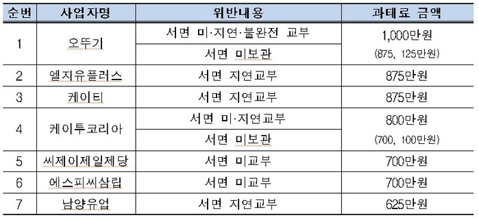 과태료는 오뚜기가 1000만원으로 가장 많았고, LG유플러스와 KT가 각 875만원, K2코리아가 800만원, SPC삼립과 CJ제일제당이 각 700만원, 남양유업이 625만원이었다.