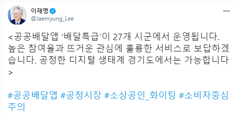 이 지사는 트위터에 공공배달앱, 공정시장, 소상공인 화이팅, 소비자중심주의 등 4개의 해시태그를 걸어 배달특급의 취지를 강조했다.