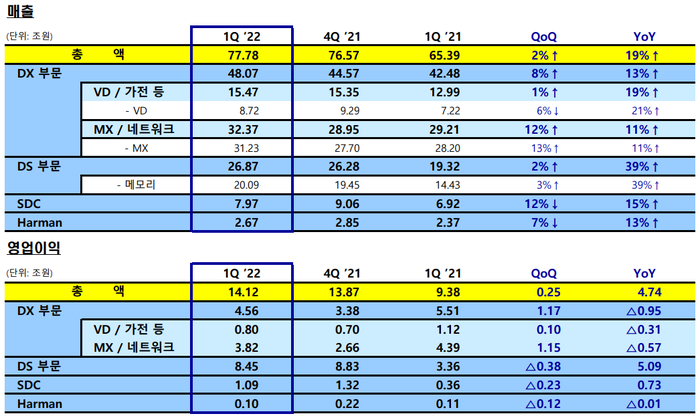 지난 1분기 DS 부문 매출은 26조 8700억 원, 영업이익은 8조 4500억 원으로 나타났다. DX 부문의 1분기 매출은 48조 700억 원, 영업이익은 4조 5600억 원이었다.