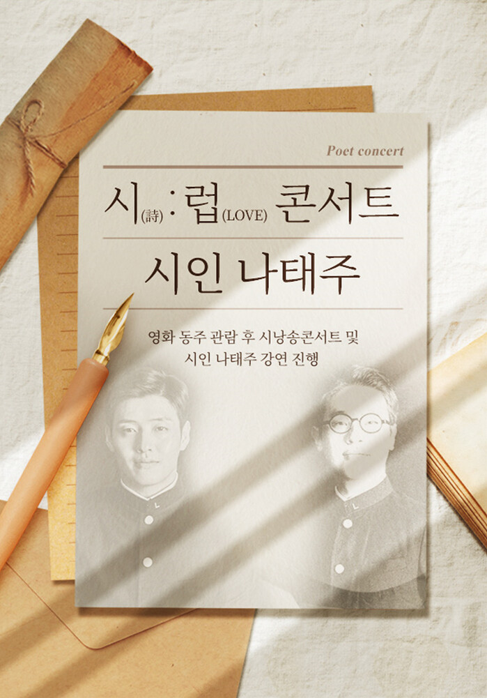 먼저 윤동주 시인과 그의 사촌 송몽규의 이야기를 담은 영화 ‘동주’를 상영하고, 이후 신재창 싱어송라이터의 시 노래 공연이 이어진다. 윤동주 시인의 ‘새로운 길’과 나태주 시인의 ‘사랑하는 마음 내게 있어도’를 노래로 만나볼 수 있다.