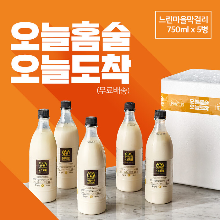이번 오늘홈술 전용 상품은 느린마을막걸리(750ml) 5병 구성으로 1만3900원 특별 가격에 선보인다. 본 구성은 오늘홈술의 론칭을 기념해 한정 수량 판매하며, 무료로 오늘 배송한다.