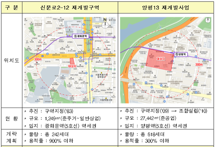 ▲ 신문로2-12 재개발구역(왼쪽)과 양평13 재개발사업 현황. [출처= 국토교통부] |