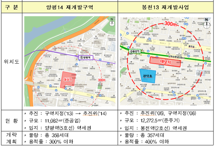 ▲ 양평14 재개발구역(왼쪽)과 봉천13 재개발사업 현황. [출처= 국토교통부] |