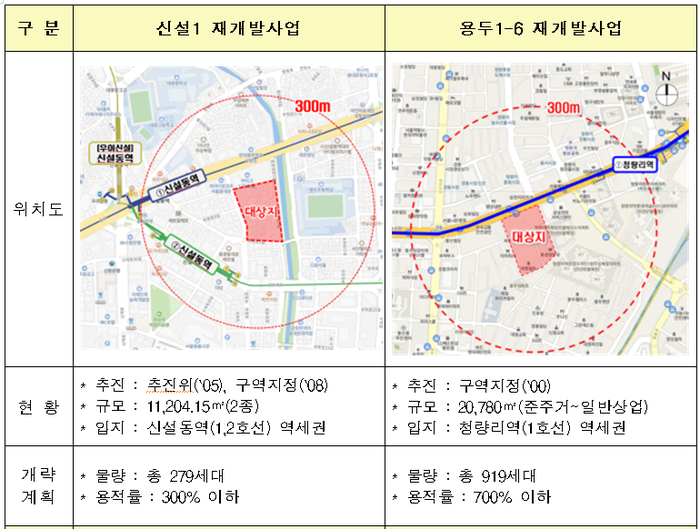 ▲ 신설1(왼쪽)과 용두1-6 재개발사업 현황. [출처= 국토교통부] |