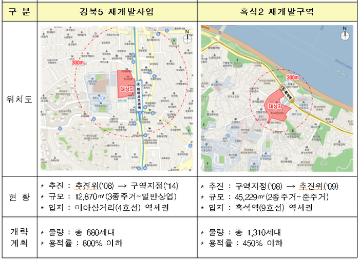▲ 강북5 재개발사업(왼쪽)과 흑석2 재개발구역 현황. [출처= 국토교통부] |