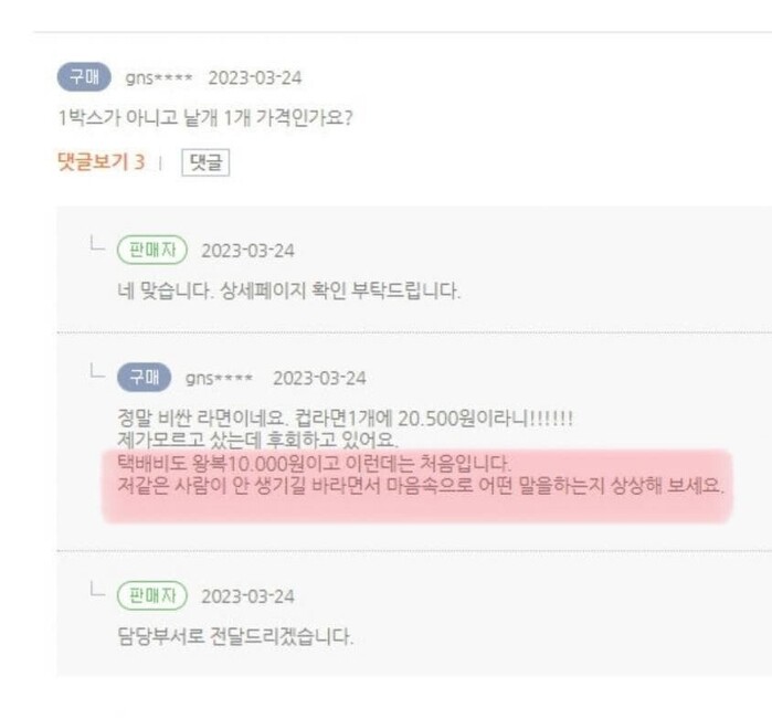 이어 “제가 자세히 안 본 잘못도 있지만 1박스 가격이지 누가 낱개라고 생각하겠냐”며 “1박스라는 말이 기재돼 있지 않아 (낱개) 1개만 와도 문제가 없고 반품 시 배송비 1만 원, 한 놈만 걸리라는 식”이라고 하소연했다.