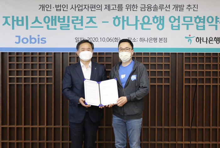 ▲ 지난 6일 하나은행 본점에서 열린 하나은행과 자비스앤빌런즈의 업무 협약식에서 박지환 하나은행 CIB그룹장(왼쪽)과 김범섭 자비스앤빌런즈 대표(오른쪽)가 기념촬영을 하고 있다. [사진=하나은행 제공] |