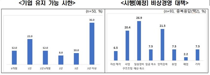 이는 인력감축 등 비상 경영을 추진해도 경제위기가 지속되면 3개사 중 1개사가 1년 이상 기업을 유지하기 어려울 만큼 경영환경이 악화되었음을 보여준다.