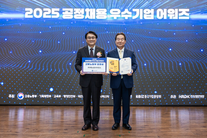 [메가경제=주영래 기자] 국내 대표 합성의약품 CDMO(위탁개발생산) 기업 제뉴원사이언스(대표 전광현, 이하 제뉴원)가 ‘2025 공정채용 우수기업 어워즈’에서 고용노동부 장관상을 수상했다고 10일 밝혔다.