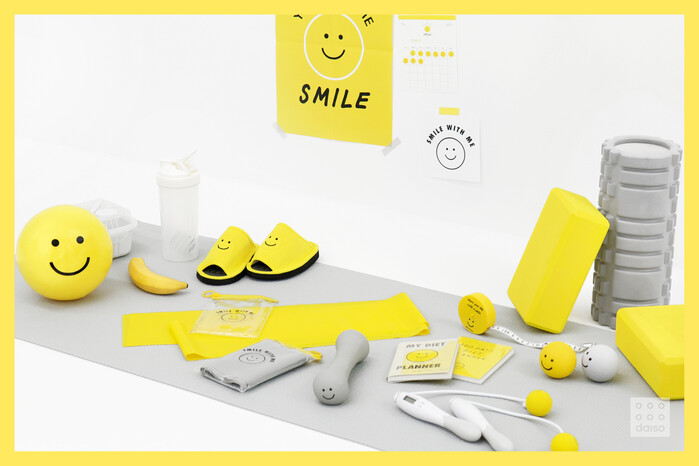 헬스용품은 ‘스마일’이라는 디자인 콘셉트가 특징이다. 상품 패키지나 상품에 노란색 바탕으로 웃는 얼굴이 그려져 있어, 운동을 다짐하는 사람들을 응원하는 느낌으로 디자인 돼 있다.