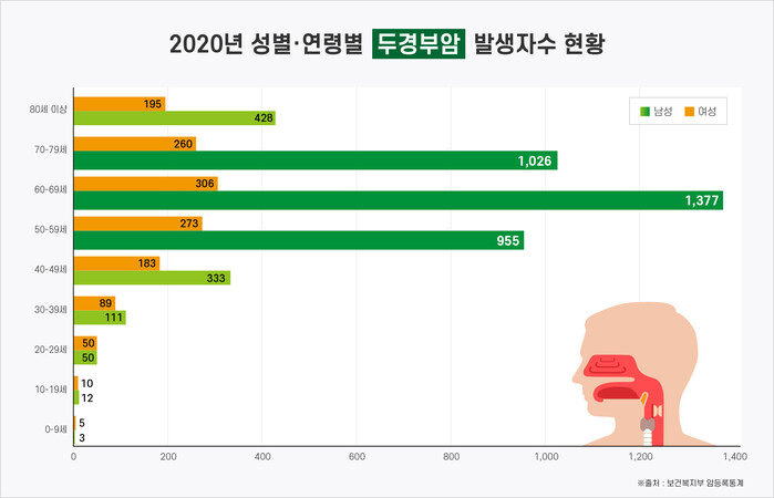 ▲2020년 두경부암 성별·연령별 발생자수 현황[사진=보건복지부 암등록통계]