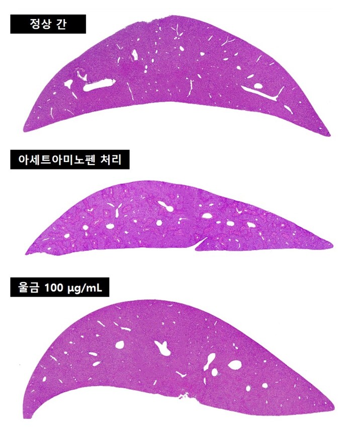 이에 더해 간 조직 상태 변화에 대한 실험도 진행됐다. 실험 결과 아세트아미노펜을 처리한 간 조직은 간 손상과 함께 전체적인 부피가 감소하는 양상이 나타났다. 이와 달리 미리 울금을 복용한 쥐의 간 조직은 정상 간과 가깝게 간 손상이 억제됐다.