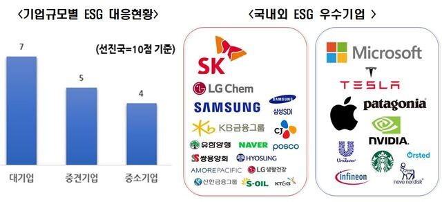 국내기업의 ESG 대응 수준에 대해 전문가들은 선진국 10점을 기준으로 대기업이 7점, 중견기업이 5점, 중소기업이 4점이라고 응답해 향후 더욱 중요성이 커질 ESG 경영에 있어 중소기업의 역량 확보가 시급한 것으로 나타났다.