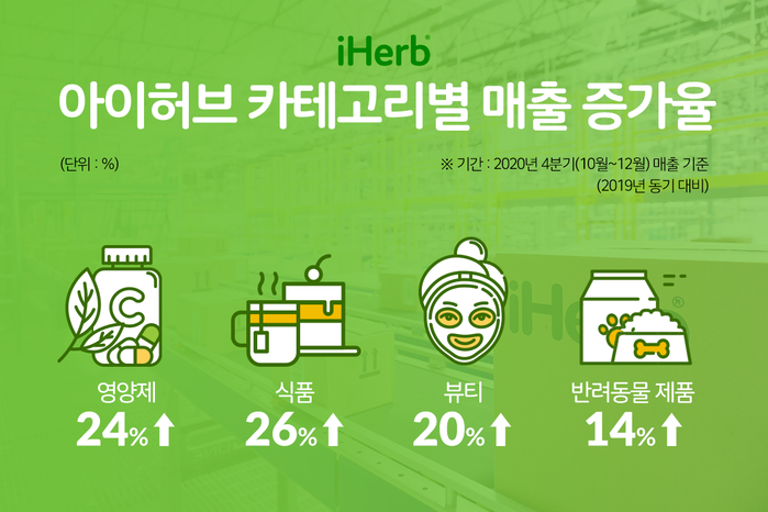 세계 최대 웰니스 제품 전문 유통기업 ‘아이허브(iHerb)’가 13일 공개한 2020년 4분기 매출 집계 결과에 따르면, 국내 아이허브 웰니스 제품 판매 매출은 전년 동기 대비 20% 상승한 것으로 나타났다.