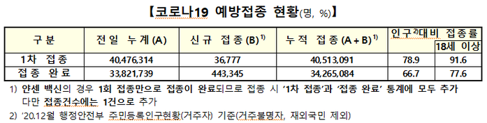 이로써 전국민(작년 12월 기준 5134만9116명) 대비 1차 접종률은 78.9%이고 18세 이상 1차 접종률은 91.6%로 늘었다. 또 전국민 대비 접종 완료율은 66.7%이고 18세 이상 접종 완료율은 77.6%로 집계됐다.