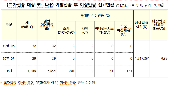 누적으로는 6755건으로, 일반이상반응 6554건, 아나필락시스 21건, 주요이상반응 171건, 사망 9건이다.