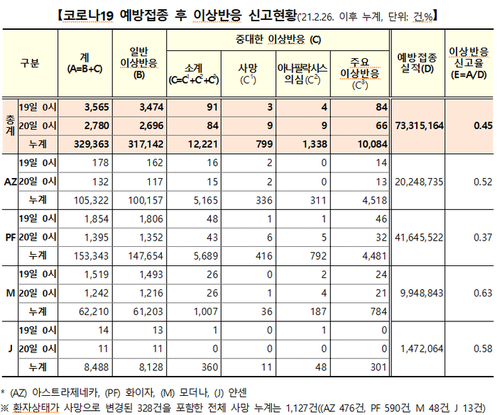 코로나19 예방접종대응추진단에 따르면, 19일 0시부터 20일 0시 기준으로 코로나19 예방접종 후 이상반응으로 의심되어 신고된 사례는 새롭게 6345건이 추가돼 총 32만9363건으로 늘었다.