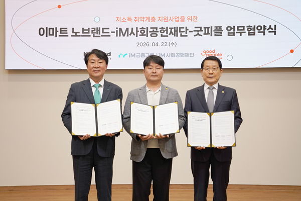 이번 협약식은 지난 22일 서울 마포구 굿피플 사옥에서 진행됐으며, 장용한 굿피플 운영부회장, 서혁진 이마트 노브랜드 지원담당, 신용필 iM사회공헌재단 상임이사 등이 참석했다.