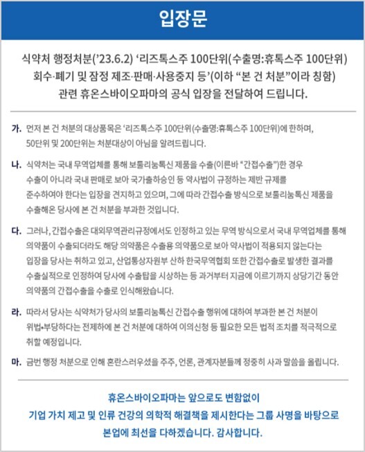 휴온스바이오파마는 홈페이지 입장문을 통해 "식약처가 당사의 보툴리눔톡신 간접수출 행위에 대해 부과한 해당 처분은 위법·부당하다"며 "이의신청 등 필요한 모든 법적 조치를 적극적으로 취할 예정"이라고 밝혔다. 또한 "간접수출은 대외무역 관리규정에서도 인정하고 있는 무역 방식"이라며 "해당 의약품은 수출용 의약품으로 봐야 한다"고 주장했다.