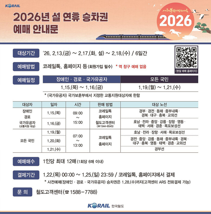이민성 코레일 고객마케팅단장은 “설 명절을 맞아 고향을 찾는 고객들이 기분 좋게 여정을 시작할 수 있도록 안정적이고 원활한 예매를 위해 최선을 다하겠다”고 밝혔다.