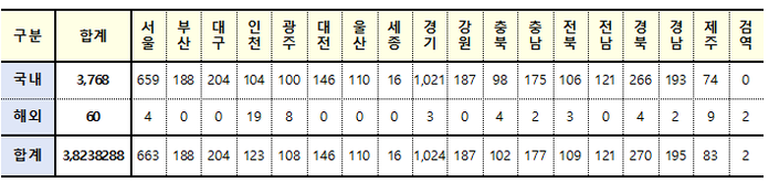 이날 신규 확진자 3828명 중 국내에서 감염된 지역발생(국내발생) 사례는 3768명이고 해외유입 사례는 60명이다.