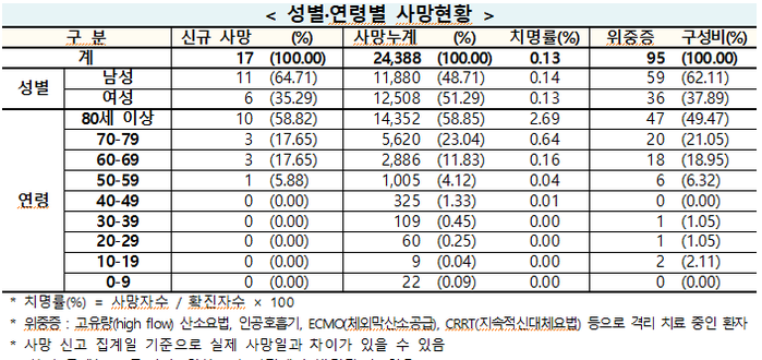 누적 사망자는 2만4388명이고 누적 치명률은 0.13%이다.