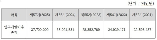 | ▲삼성전자 2021~2025년 연구개발비용 총계표. [사진=전자공시] |