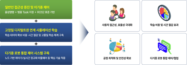 이러한 한계를 극복하기 위해 디지털트윈 기술을 활용한 ‘다기종 협업 AI로봇 플랫폼’이 해법으로 부상하고 있다. 디지털트윈 환경에서 실제 환경과 동일하게 구현되고 고품질 행동 데이터를 생성·학습함으로써 데이터 부족 문제를 해결하고 중견 기업의 진입 장벽을 낮추는 것이 핵심이다. 해당 플랫폼의 기술 개발은 다중제어 기술을 가속화하여, 다기종 로봇 간의 유기적 협업과 안전성을 동시에 확보하는 결정적 분기점이 될 것으로 전망된다.
