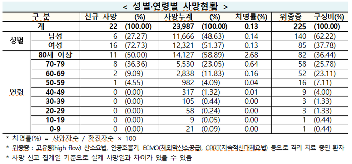 사망자도 전날(54명)보다 32명 줄어 22명이었다. 사망자 수는 지난달 30일(70명)부터 24일 연속 두 자릿수를 보이고 있다.사망자를 연령대로 보면 80세 이상이 11명으로 절반을 차지했고, 이어 70대 8명, 60대 2명, 50대 1명이었다.