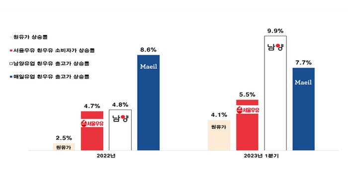 특히 2023년 1분기 원유가가 전년 대비 평균 4.1% 상승한 데 반해, 서울우유는 전년 대비 흰 우유 소비자 가격을 5.5% 인상했고, 남양유업은 출고가 9.9% 인상, 매일유업은 출고가를 7.7% 인상시켜 소비자 가격이 원유가 상승 대비 2배 이상까지 오른 것으로 분석했다.