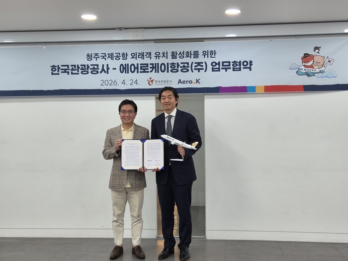 에어로케이항공 관계자는 “이번 협약을 통해 단순 항공 운송을 넘어 청주공항 중심의 지역 관광 생태계를 구축하는 계기가 될 것”이라며 “핵심 노선 외래객 수요를 적극 발굴하고, 중부권 관광의 실질적 체류 및 소비 확대를 이끌겠다”고 말했다.