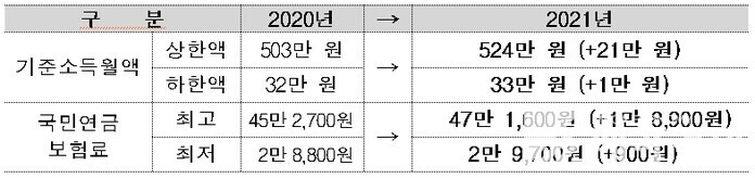 | ▲ 2021년 달라지는 국민연금 기준소득월액과 보험료 [자료=보건복지부 제공] |