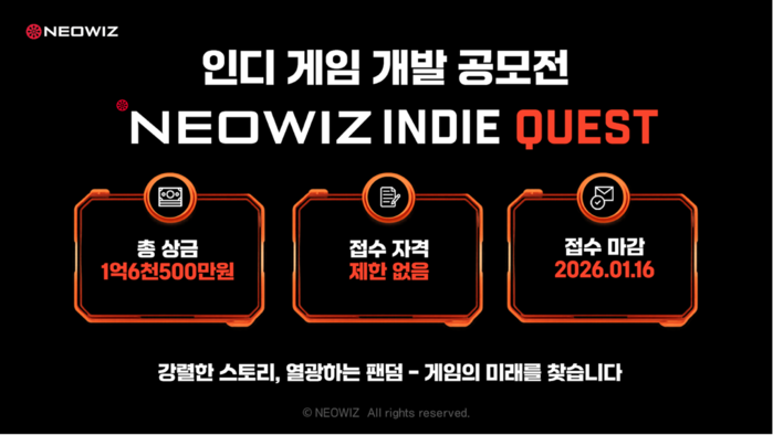 네오위즈 관계자는 “네오위즈는 인디 게임을 포함한 새로운 개발 프로젝트를 발굴할 때 탄탄한 IP, 게임의 명확한 정체성, 잠재적 팬층을 형성할 수 있는 재미 등을 종합적으로 판단한다”며 “접수 마감이 약 2주 앞으로 다가온 ‘네오위즈 인디 퀘스트’를 통해 보다 많은 글로벌 창작자들과 만나볼 수 있게 되길 기대한다”고 말했다.
