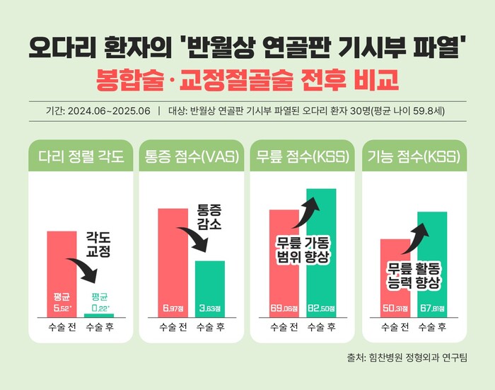 연구 결과 △다리 정렬 각도는 5.52도→0.22도 △통증 VAS 점수는 6.97점→3.63점 △KSS Knee score는 69.06점→82.50점 △Function score는 50.31점→67.81점으로 각각 개선됐다.
