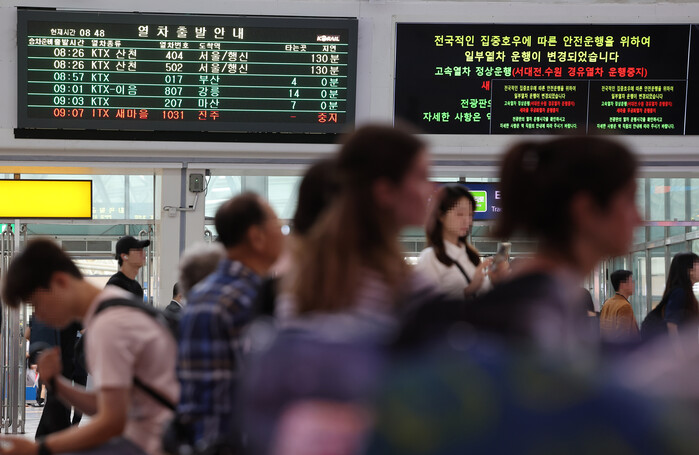 ▲사진은 지난 18일 오전 서울역에 일부열차 운행 변경 관련 안내문이 나오고 있는 모습. [사진=연합뉴스] |