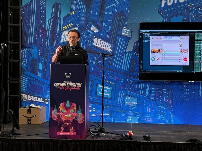 | ▲ 사진설명 : 스콧 시(Scott Shi) Kite AI 공동 창립자 겸 CTO가 이더덴버 메인 스테이지에서 AI 기반 신뢰 서비스에 대해 설명하고 있다 |