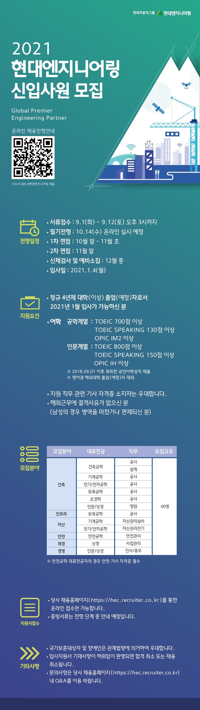 서류접수는 오는 9월 12일 오후 3시까지 진행되며, 서류전형, 필기전형, 면접전형의 절차를 거쳐 2021년 1월 현대엔지니어링에 최종 입사하게 될 미래인재를 채용한다.