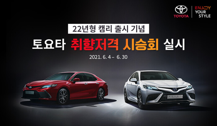 토요타코리아는 2022년형 캠리 출시를 기념해 4일부터 오는 30일까지 토요타의 다양한 하이브리드 모델을 체험할 수 있는 ‘취향저격 시승회’를 전국 토요타 공식 딜러 전시장에서 실시한다고 밝혔다.