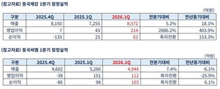 [메가경제=박제성 기자] 동국제강은 별도 재무제표 기준 2026년 1분기 매출 8572억 원, 영업이익 214억 원, 순이익 62억원을 기록했다고 24일 밝혔다. 전 분기대비 매출 5.2% 증가, 영업이익은 2886.2% 증가, 순이익은 흑자로 전환했다. 전년동기대비 매출은 18.1% 증가, 영업이익은 403.9%증가, 순이익은 153.3% 증가했다.
