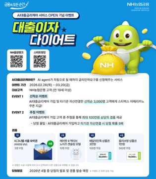 [메가경제=최정환 기자] NH농협은행은 대출보유 고객의 금리 부담을 낮출 수 있도록 돕는 ‘AI대출금리케어’ 서비스 출시를 기념해 다음달 20일까지 '대출이자 다이어트' 이벤트를 진행한다고 26일 밝혔다.이벤트는 두 가지 방식으로 진행된다. 첫 번째는 NH마이데이터에서 다른 금융기관 자산연결을 하고 ‘AI대출금리케어’ 서비스에 가입한 고객 중