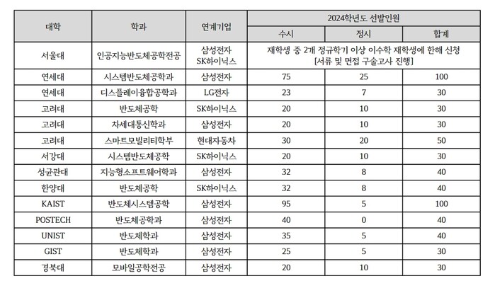 서울대는 삼성전자와 SK하이닉스 취업연계인 인공지능 반도체공학전공을 운영하고 있다. 다만 수시와 정시로 선발하지 않고 재학생 중 2개 정규학기 이상 이수한 학생들 중 평균학점이 2.7점이상이며 33학점이상 취득한 학생에 한해 서류평가 및 구술면접을 진행해 선발한다.