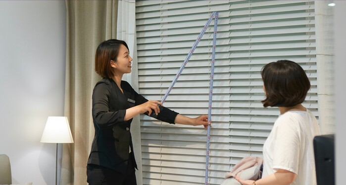 ▲ 한샘 홈 스타일 리스트가 고객 앞에서 블라인드 실측을 하고 있는 모습. [사진=한샘 제공] |