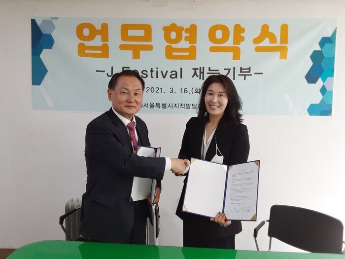 ▲ 서울지적발달장애인복지협회 이갑용 회장(왼쪽)과 J페스티벌 이진주 대표가 지난 16일 서울 양천구 신정동 협회사무실에서 음악공연 재능나눔을 위한 업무협약(MOU)을 맺었고 밝혔다. [사진= 서울지적발달장애인복지협회 제공] |