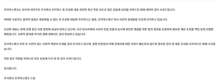 조이웍스앤코 측은 홈페이지를 통해 "어떠한 이유로도 물리적 충돌은 정당화될 수 없다"며 "사안을 엄중하게 인식하고 있으며, 사법 절차에 성실히 임하겠다"는 입장을 밝혔다.