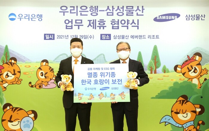 우리은행이 삼성물산 에버랜드와 ESG 협력 강화를 위한 업무협약을 맺었다. 한국 호랑이종 보존 후원 등 생태, 동물 보호 공동 캠페인 등을 진행한다. 또, 양사는 온, 오프라인 플랫폼 기반 상호 마케팅, 캠페인 등의 협력을 강화하기로 했다.