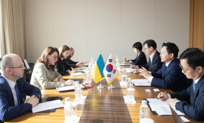 ▲ 원희룡 국토교통부 장관이 지난 17일 서울에서 율리야 스비리덴코우크라이나 제1부총리 겸 경제개발무역장관과 만나 우크라이나 전후 재건 협업에 대해 논의하고 있다. [사진=국토교통부] |