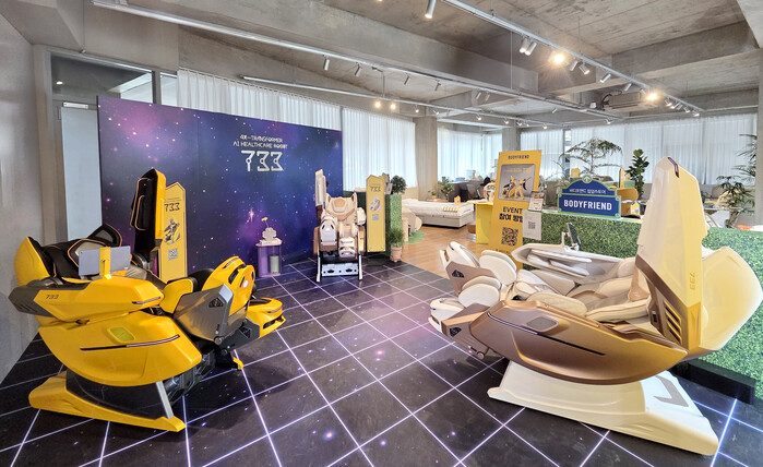 이번 공간은 회사의 사명인 ‘인류의 건강수명 10년 연장’을 콘셉트로 조성됐다. 전시 공간에는 최근 출시된 웨어러블 AI 헬스케어 로봇 ‘733’을 비롯해 퀀텀AI, 의료기기 ‘메디컬파라오’와 ‘메디컬팬텀로봇’, 콤팩트 헬스케어 로봇 ‘팔콘S’, 마사지 소파 ‘파밀레S·파밀레C’, 라클라우드 헬스모션, W정수기 등이 거실과 침실 콘셉트로 배치됐다.