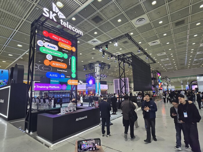 'All about AI(AI의 모든 것)'를 전시 콘셉트로 864㎡(약 262평) 규모의 대형 전시관을 마련한 SK텔레콤은 AI 인프라부터 모델, 서비스까지 풀스택 AI 전 영역 등 AI의 미래 청사진을 제시했다.