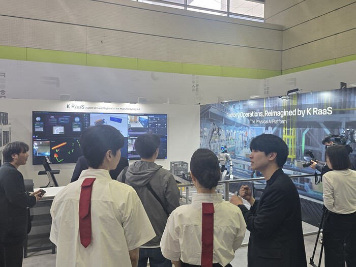 ‘피지컬 AI’ 공간에서는 산업 현장을 그대로 옮겨놓은 듯한 시연이 펼쳐졌다. ‘K RaaS(KT Robot as a Service)’를 기반으로 다양한 로봇과 설비가 하나의 AI 에이전트 체계로 연결되며 자율적으로 협업하는 모습이 구현됐다. 이기종 로봇 간 협업 시나리오가 실제 환경처럼 연출되며 관람객들의 발걸음을 붙잡았다.