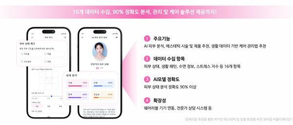 또한, AI피부분석 시스템은 딥러닝 기반 이미지 분석 기술을 적용하고 빅데이터를 활용해 개인별 피부 상태를 정밀하게 분석한다. 이 AI피부분석 시스템은 기존 문진법 대비 정확도를 향상시키는 것을 목표로 하며, 협약 기간 내 AI피부진단 알고리즘의 정확도를 90% 이상으로 향상시키는 것을 목표로 한다.